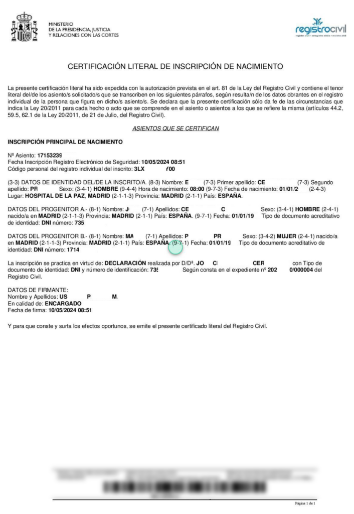 این گواهی تولد، تا زمان دریافت پاسپورت و کارت NIE، مدرک رسمی هویتی فرزند شما هست.